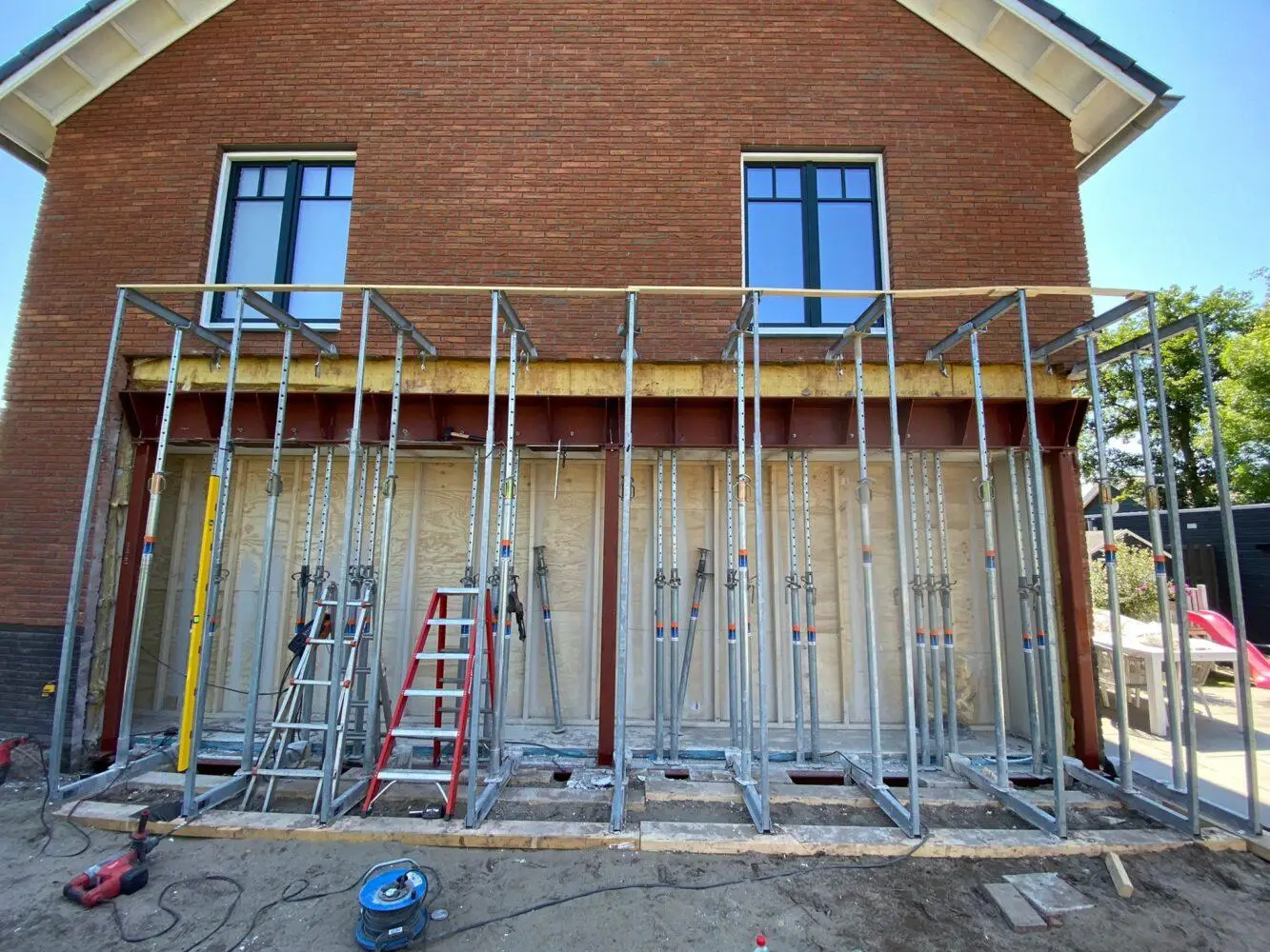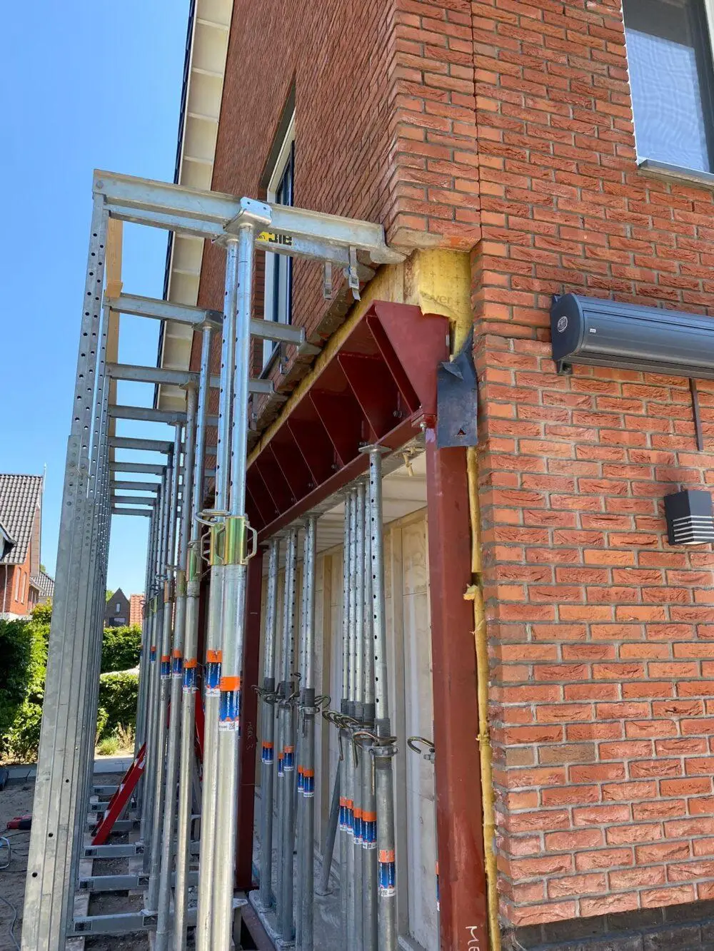 De grootste uitdaging van dit project was het aanbrengen van de staalconstructie over een lengte van ruim 8 meter. Zie foto hieronder. Alles is blijven staan en zijn er geen scheuren opgetreden in het bestaande gevelmetselwerk en in de binnenwanden op de 1e verdieping. Materialen die wij konden hergebruiken zijn een gevelkozijn en luiken aan de voorgevel.