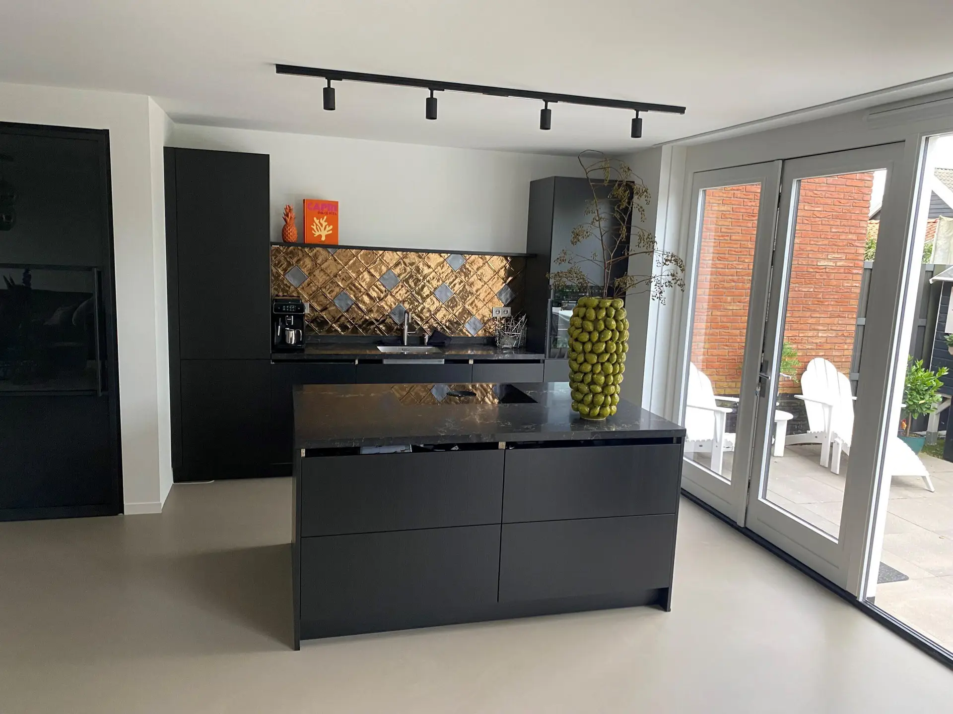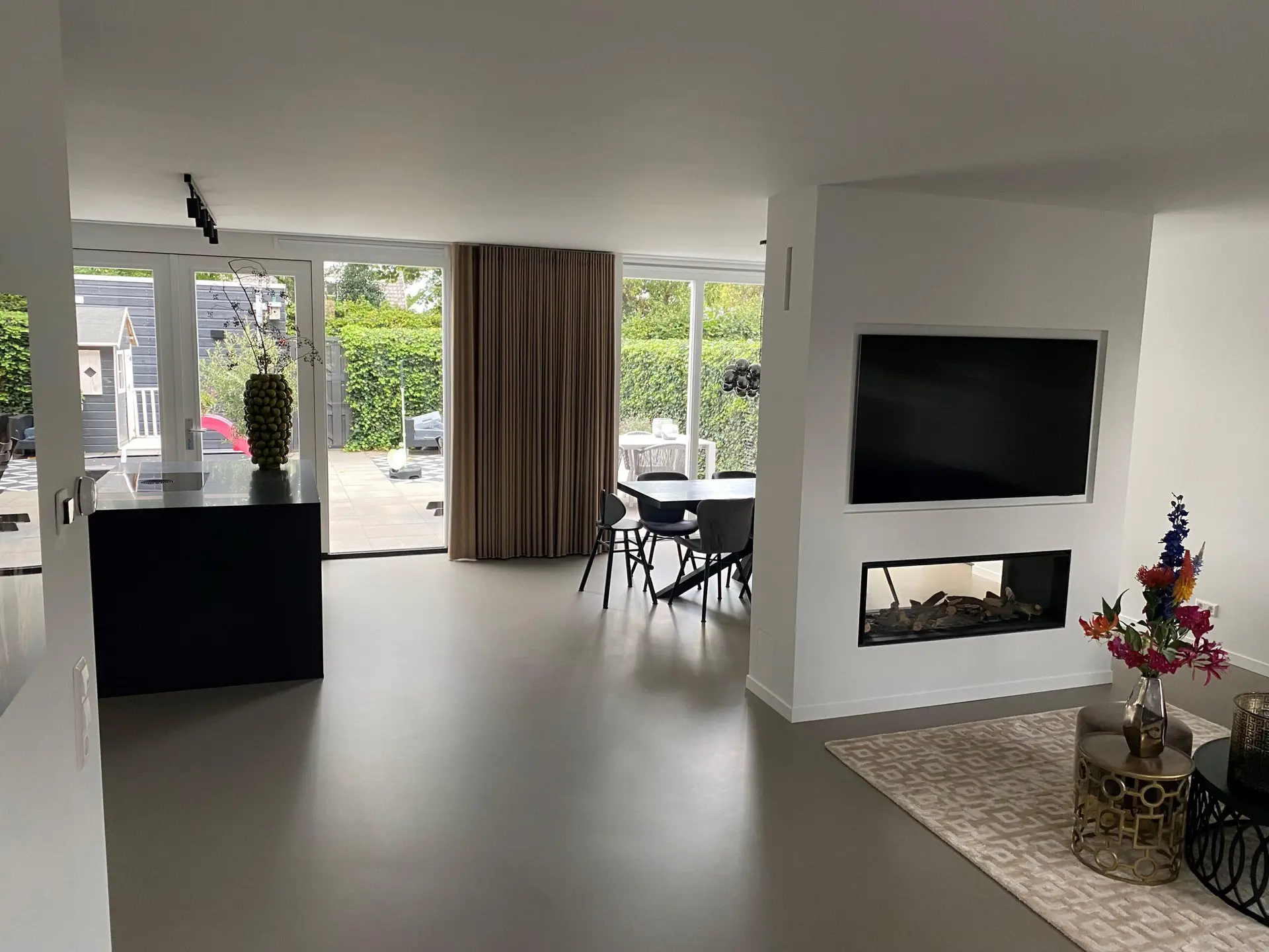 Alle muren en plafonds zijn strak afgewerkt en wit geschilderd. De vloer is gecoat en de keuken is verplaatst van de voorgevel naar de achtergevel. Er is ruimte genoeg voor een mooi groot kookeiland, een droom die is uitgekomen. Installaties hebben wij allemaal verplaatst van voor naar achteren en is het gas afgesloten voor het koken, vanaf nu alleen elektrisch koken. De aanbouw is volledig voorzien van vloerverwarming aangelegd door Gasservice Noordholland.