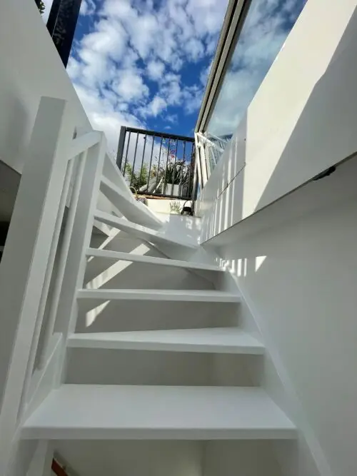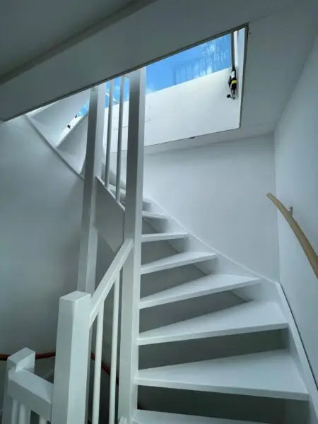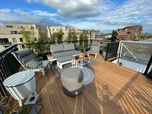 Dat hebben wij voor hem gerealiseerd middels het aanleggen van een dakterras. Met een elektrisch bedienbaar dakluik is het dak nu via een vaste houten trap te bereiken. Het dak is volledig voorzien van een hardhouten vlonder van 25 m2. Het terras is rondom volledig voorzien van een stalen gepoederd coat hekwerk. Onze opdrachtgever kan nu volop genieten van zijn eigen buitenruimte en privacy.