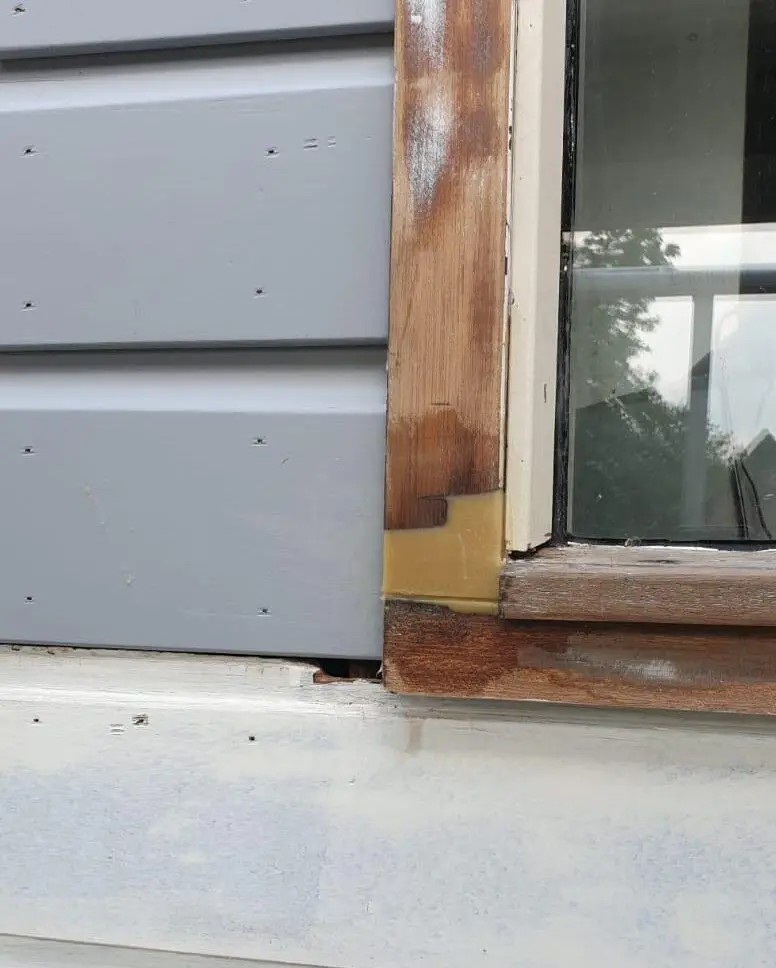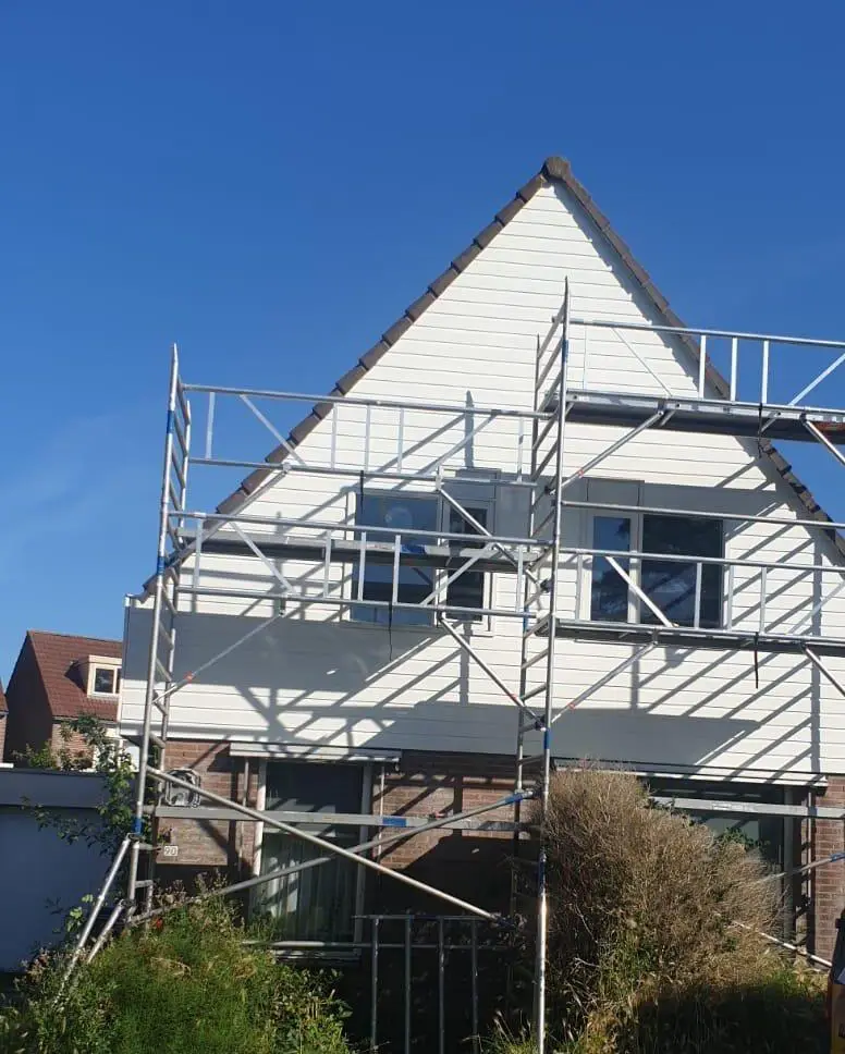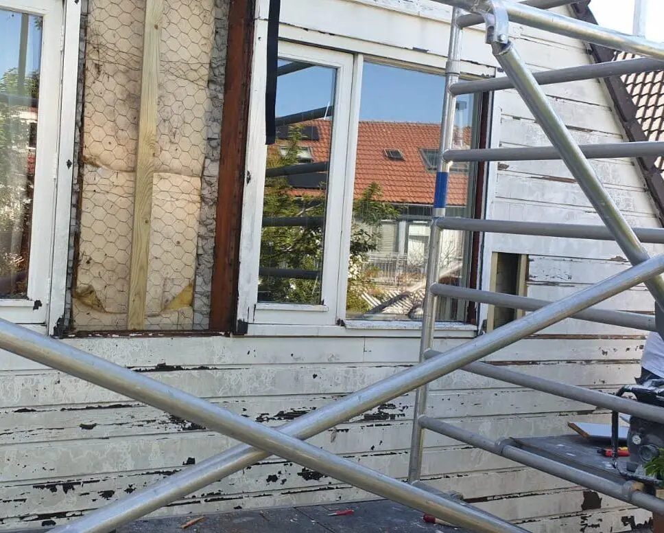 Wij beschikken over eigen steigermateriaal en onze schilders bouwen deze steigers ook zelf op en breken deze ook zelf weer af. Tijdens het kaal halen van de houten geveldelen kwamen ze veel houtrot tegen. Diverse houten rabatdelen zijn ook door de schilders zelf vervangen. Rotte delen aan de houten gevelkozijnen zijn gerepareerd met Repair Care.