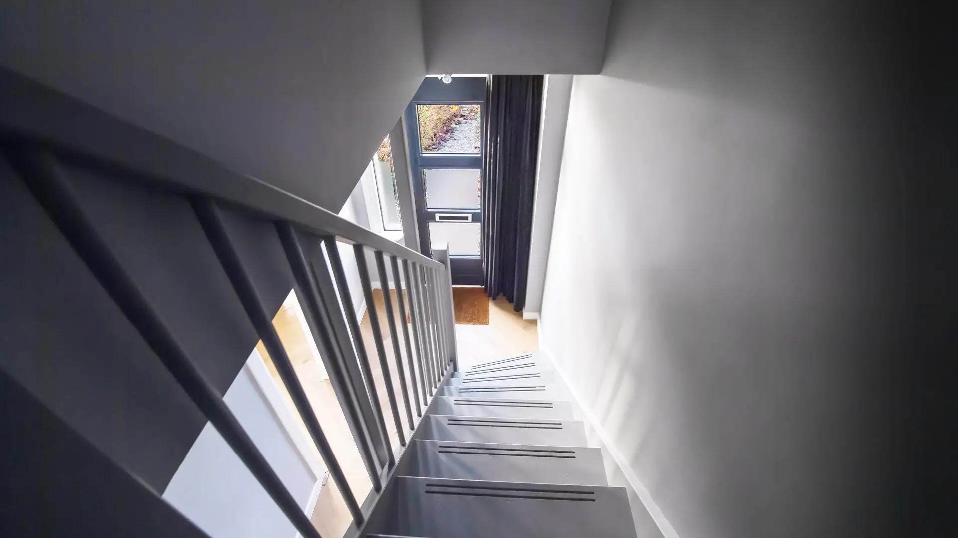 Het woonhuis wordt volledig leeg gesloopt, constructies worden versterkt en aangepast (zie foto). Alle installaties worden vernieuwd en op de 1e verdieping wordt de volledige indeling gewijzigd. Belangrijkste struikelblok was de smalle en lage trap waardoor indeling gewijzigd diende te worden.