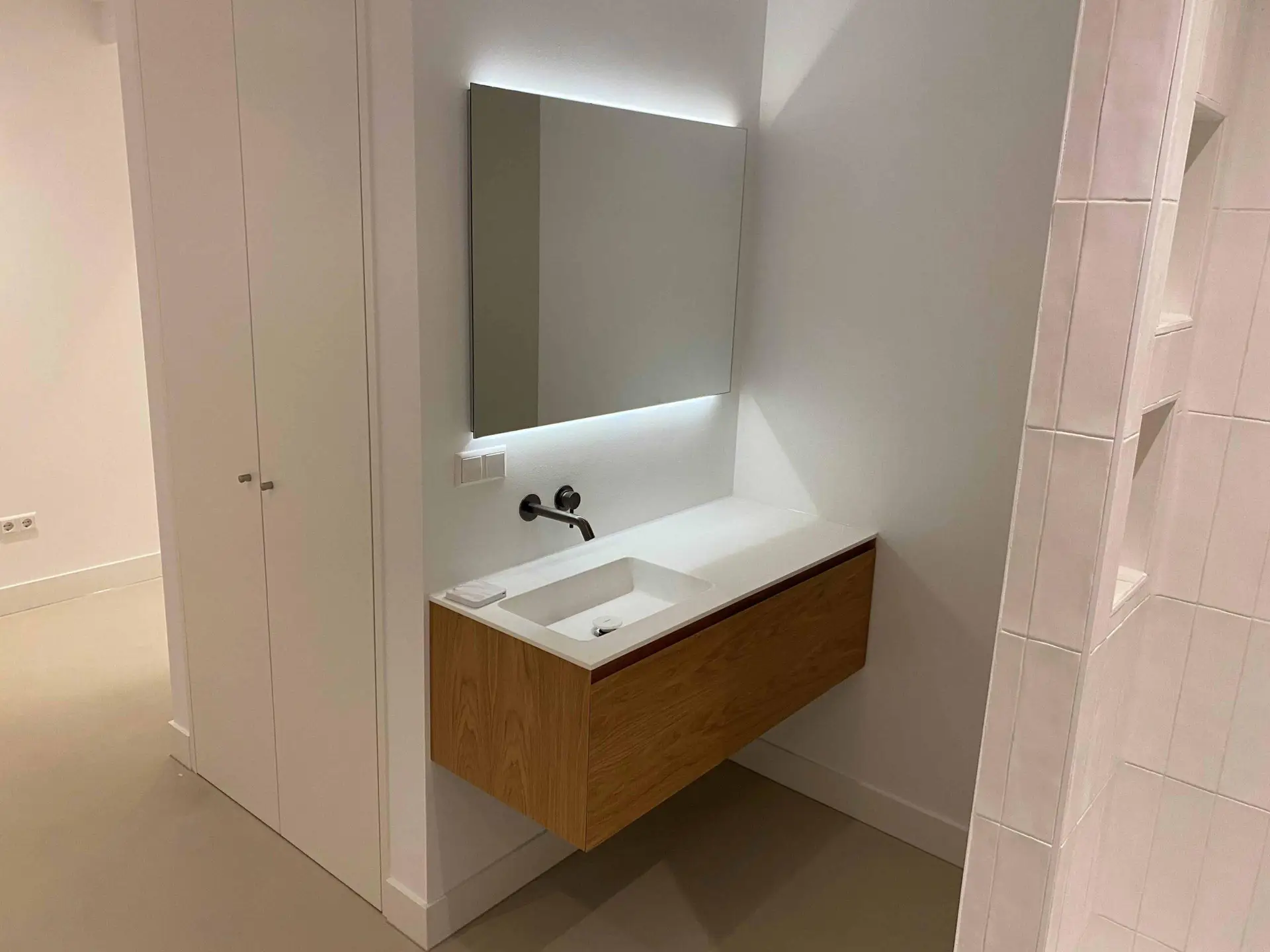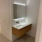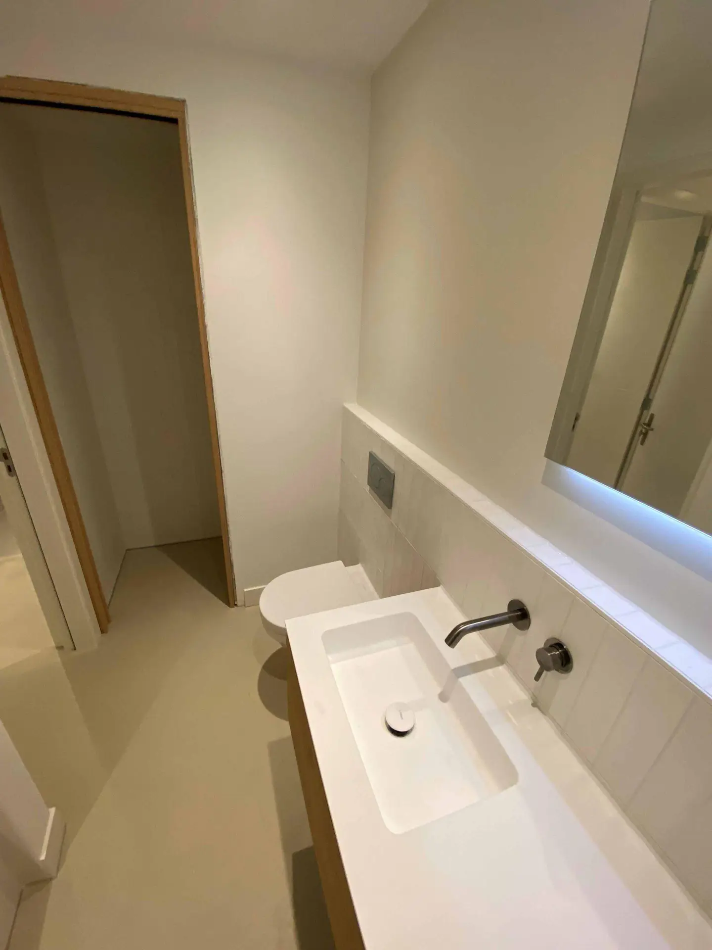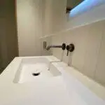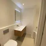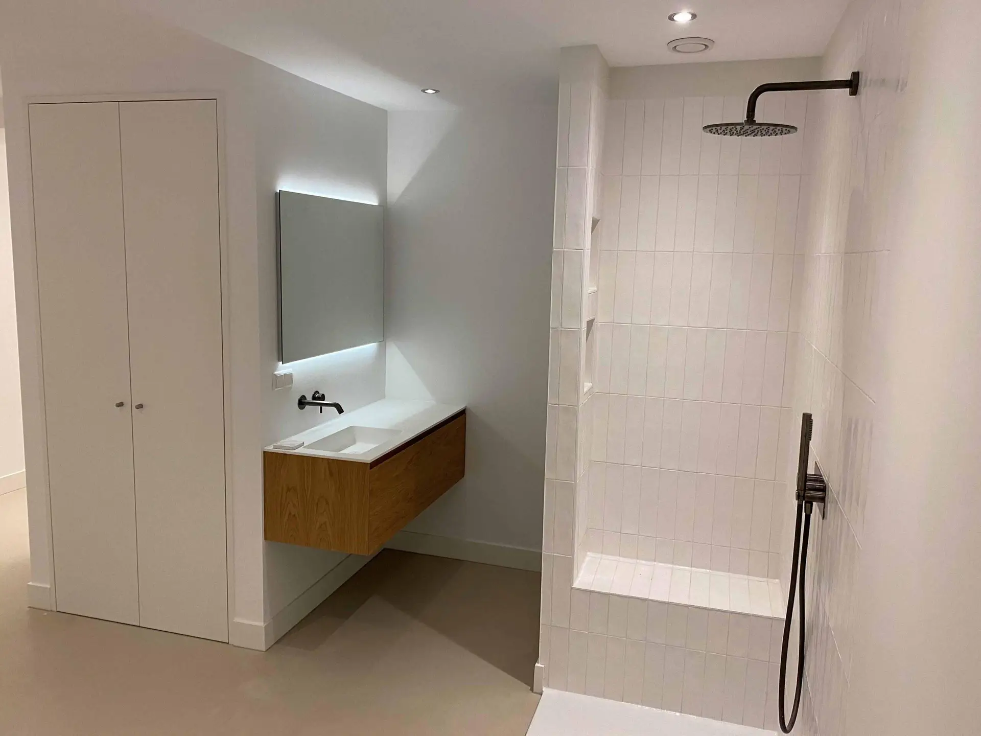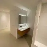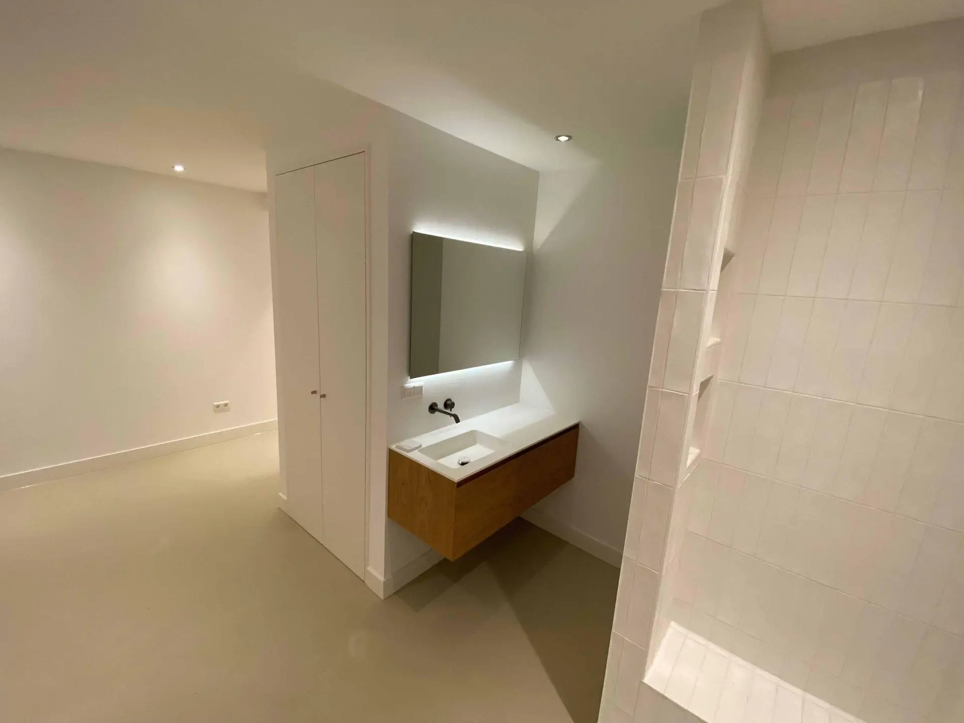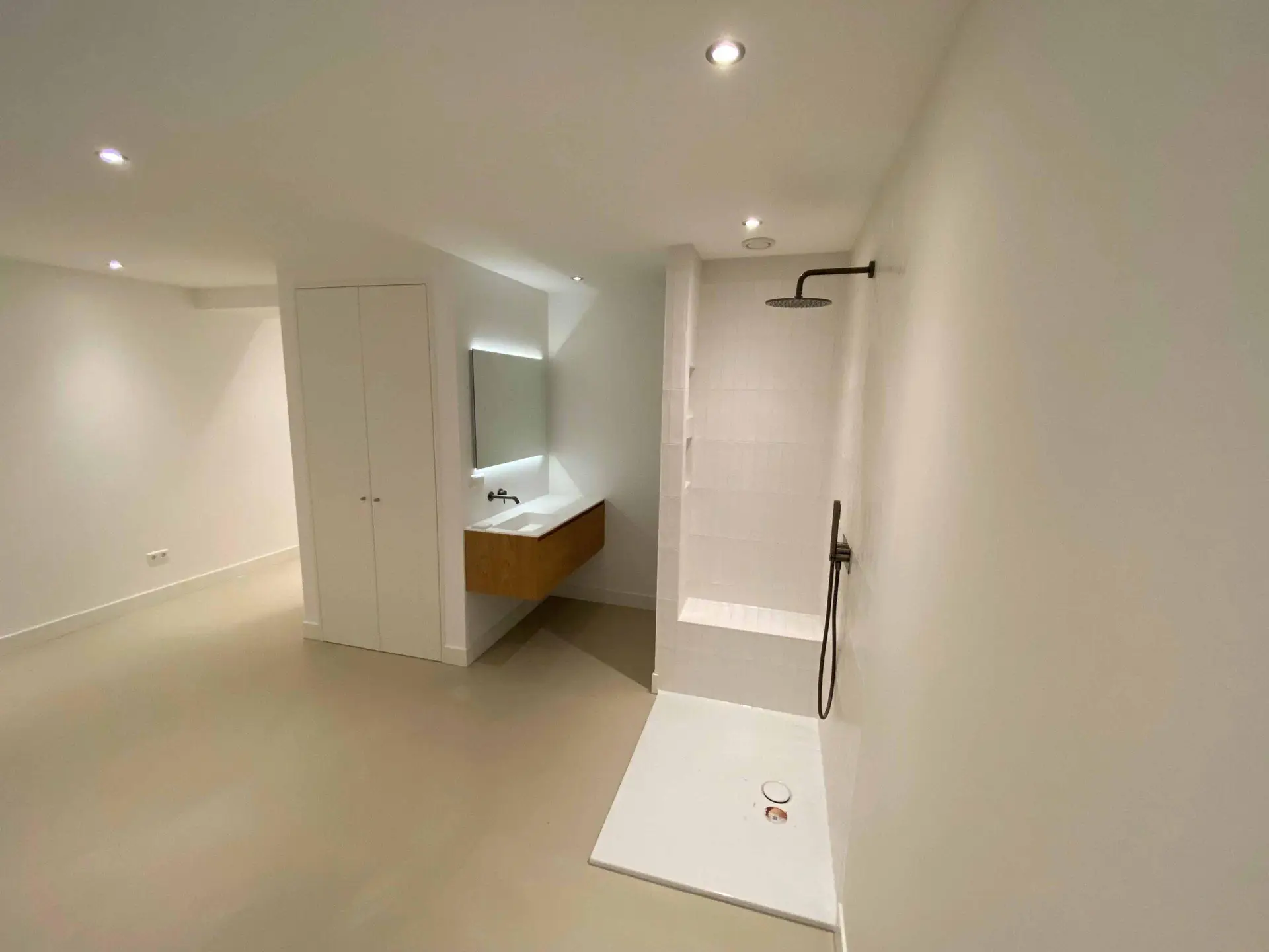 Na het slopen van alle elementen in zowel de kelder als de tuinkamer tot op de betonnen constructie, hebben we enkele wekenlang een ontvochtiger in de kelder geplaatst om de betonnen constructie volledig te laten drogen. Na het drogen hebben we vloerverwarming aangebracht en de vloer voorzien van een coatingvloer. Vervolgens hebben we binnenwanden geplaatst, inclusief alle benodigde installaties, en is het verlaagde plafond geïnstalleerd. Alle wanden en plafonds zijn afgewerkt en klaargemaakt voor schilderwerk. Onze schilders hebben het geheel na droging geschilderd. Voor de twee kleinere ruimtes, de waskast en de pompput, zijn schuifdeuren geïnstalleerd om de kelder efficiënter in te richten.